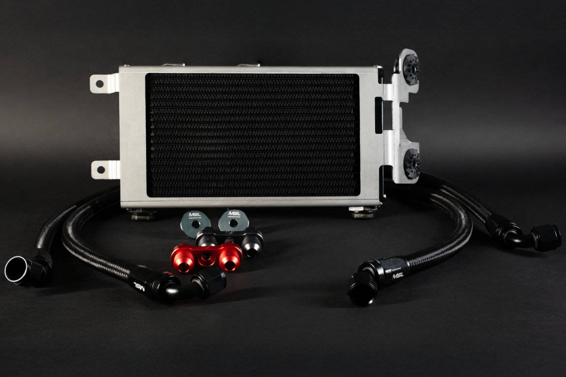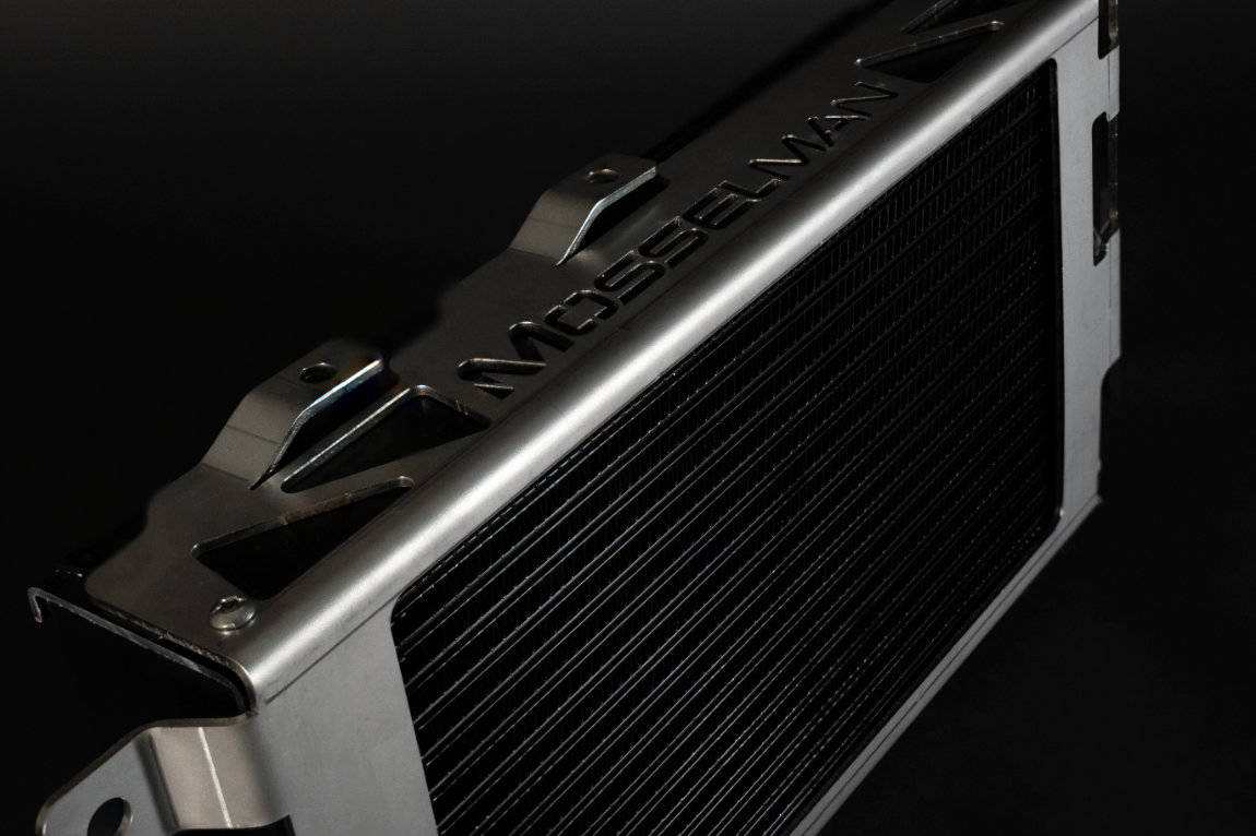 The twin oil cooler extension kit is an add-on product and requires the Mosselman Single Oil Cooler Kit to function. This kit is not “plug-and-play.” Some modifications to the car are necessary to accommodate the larger oil cooler and bracket. Additional OEM parts required for installation include: the left front oil cooler air duct, left wheel arch air duct, and the inner wheel arch for the auxiliary cooler (left side).