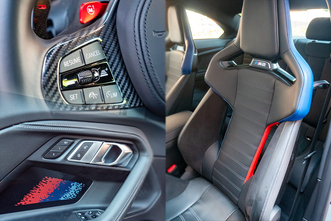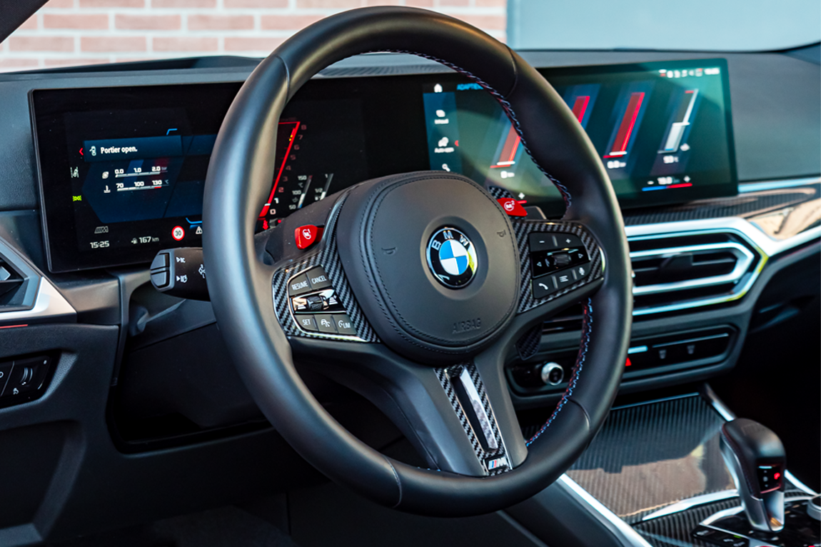 M Carbon kuipstoelen zorgen dat je stevig zit, de dakhemel van antraciet en de Carbon Fibre interieurlijsten geven een premium ambiance.